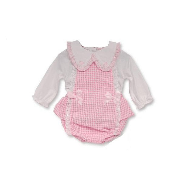 Baby Girls Pink & White Dogtooth 'Bow and Lace' Short Dungaree Set—This charming outfit features a collared top with a large collar adorned with contrasting frill trim and delicate bows. The top fastens at the back for easy dressing.
