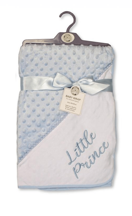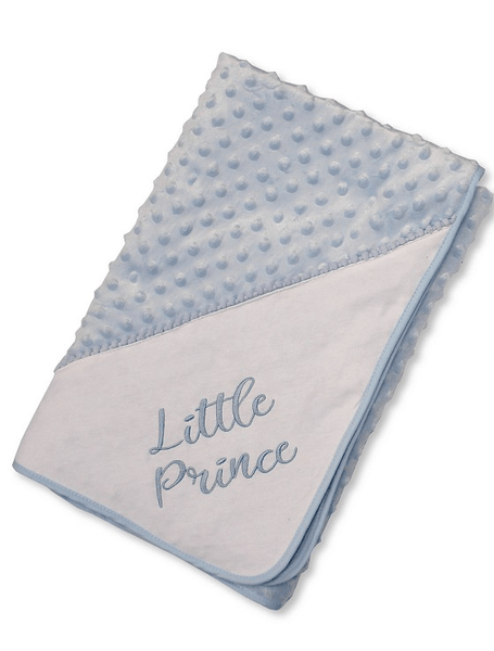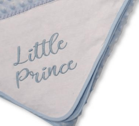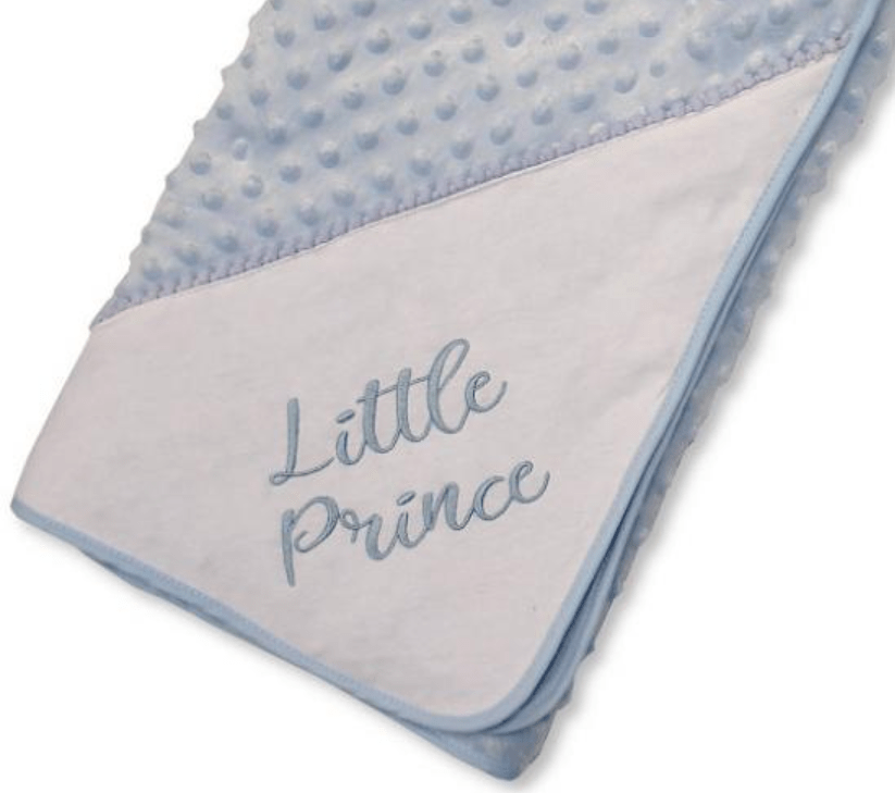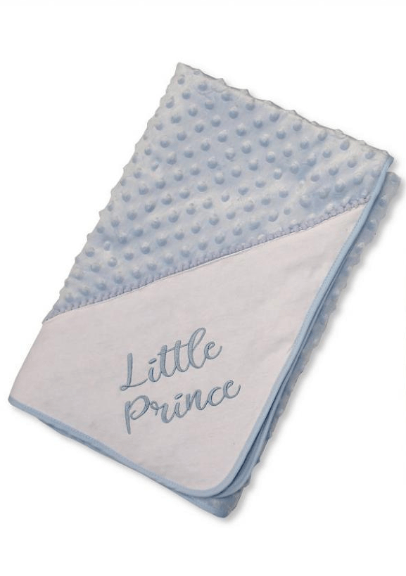 Introducing the Blue Baby Boys' First Blanket by Nursery Time – the perfect cosy wrap for your little prince. This luxurious white and blue bubble blanket, measuring 85cm x 85cm, features an embroidered 'Little Prince' motif, adding a touch of royal charm.