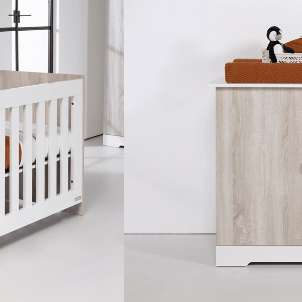Introducing Babystyle's Verona 2 Piece Nursery Furniture Set, a sophisticated addition to our Charnwood collection. This ensemble includes a versatile cot bed designed to seamlessly adapt and grow with your child and a spacious dresser with a cot top changer. The Verona set, adorned with a chic combination of bright white and light ash finishes, effortlessly elevates any nursery with a timeless sense of style.
