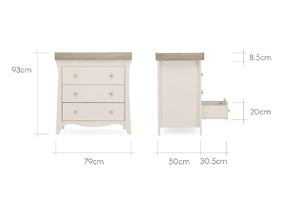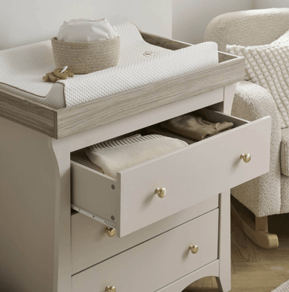 The Clara Dresser Changer is a multifunctional piece that combines elegant storage with a practical changing station. Featuring three spacious drawers, this dresser offers ample space for all your baby essentials, from nappies to clothing. The removable changing top adds versatility, allowing the dresser to transition seamlessly into a standalone piece of furniture as your child grows.