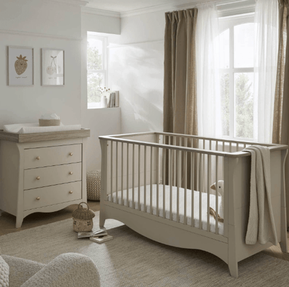 Elevate your nursery with the Clara 2-Piece Cashmere Nursery Furniture Set, a blend of luxury and practicality that transforms your baby’s room into a haven of warmth and elegance. This beautifully designed set combines a chic cashmere finish with brushed gold handles, offering a timeless and versatile style that is perfect for any nursery, regardless of gender. The Clara set includes a cot bed and a dresser changer, each crafted with meticulous attention to detail and functionality.