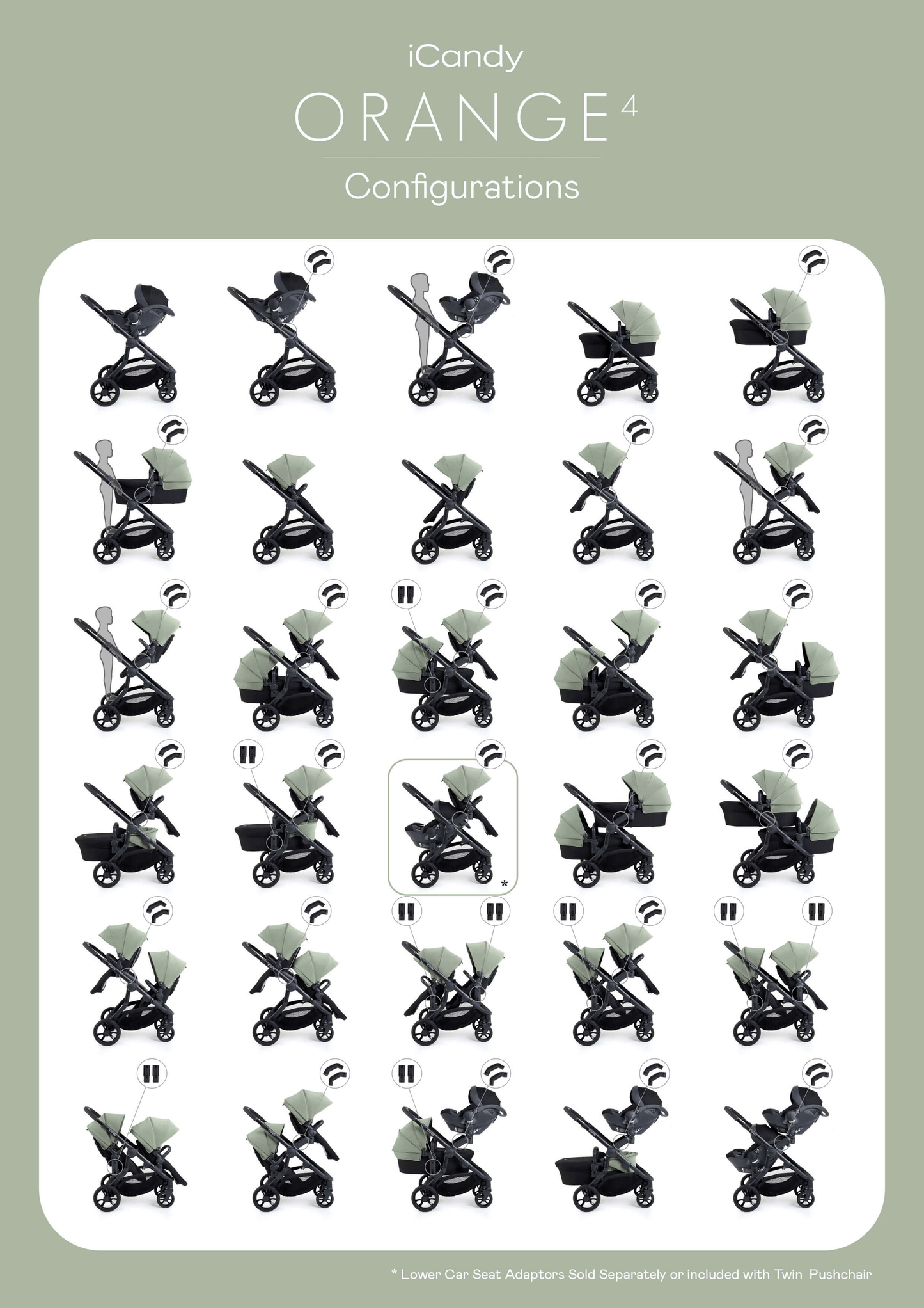 Introducing the Roll Up & Dine Feature: With over 30 unique pushchair configurations and combinations*, the Orange 4 offers unparalleled versatility. Elevator adaptors in world-facing mode enable the seat unit to transform into Roll Up & Dine mode, allowing your baby to join family mealtimes wherever you are. Enjoy seamless integration of parenting and dining experiences with the iCandy Orange 4.