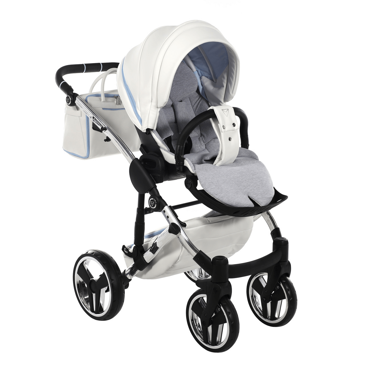Experience the perfect blend of style, comfort, and functionality with the Junama Diamond Candy Blue pram. This stunning pram boasts a sleek design featuring a white carrycot with a striking diamond pattern, complemented by a shimmering silver frame, silver wheel rims, and luxurious eco-leather detailing. The high-quality eco-leather hood is easy to clean, ensuring it stays looking fabulous throughout your adventures.