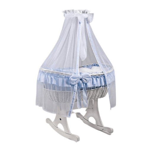 MJ Marks Ophelia Rocking Crib White Wicker Crib with Blue Bedding & Drapes