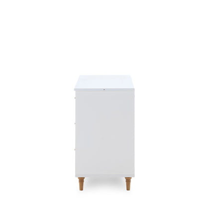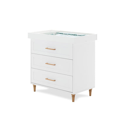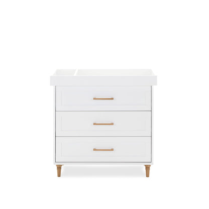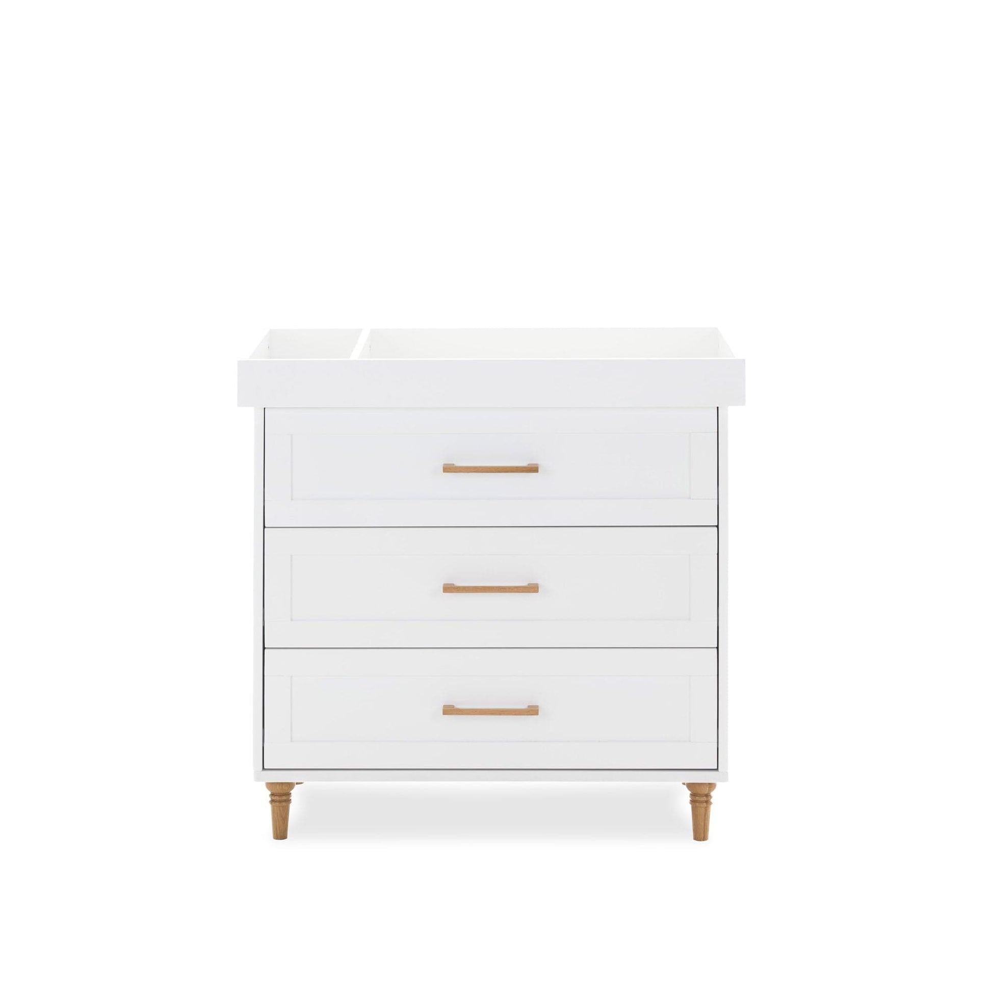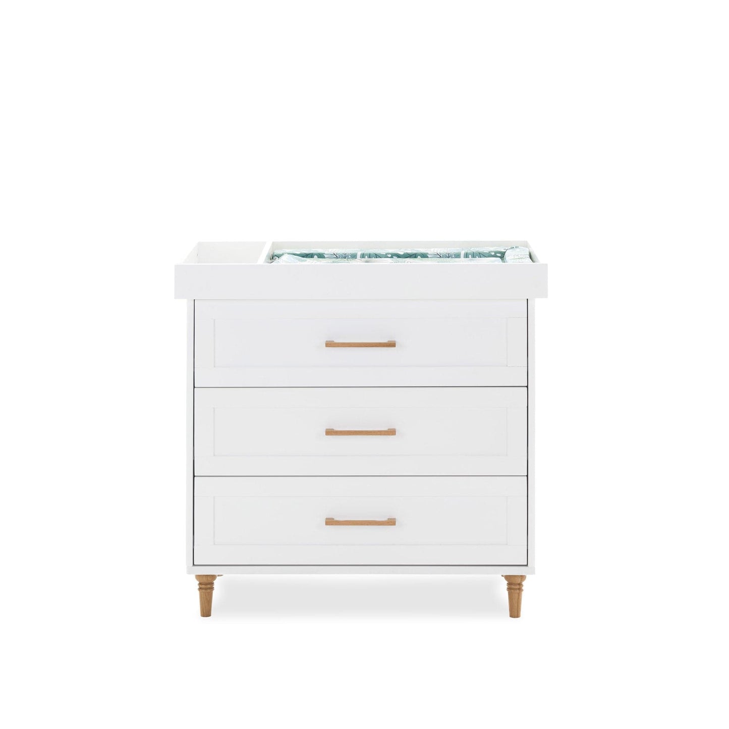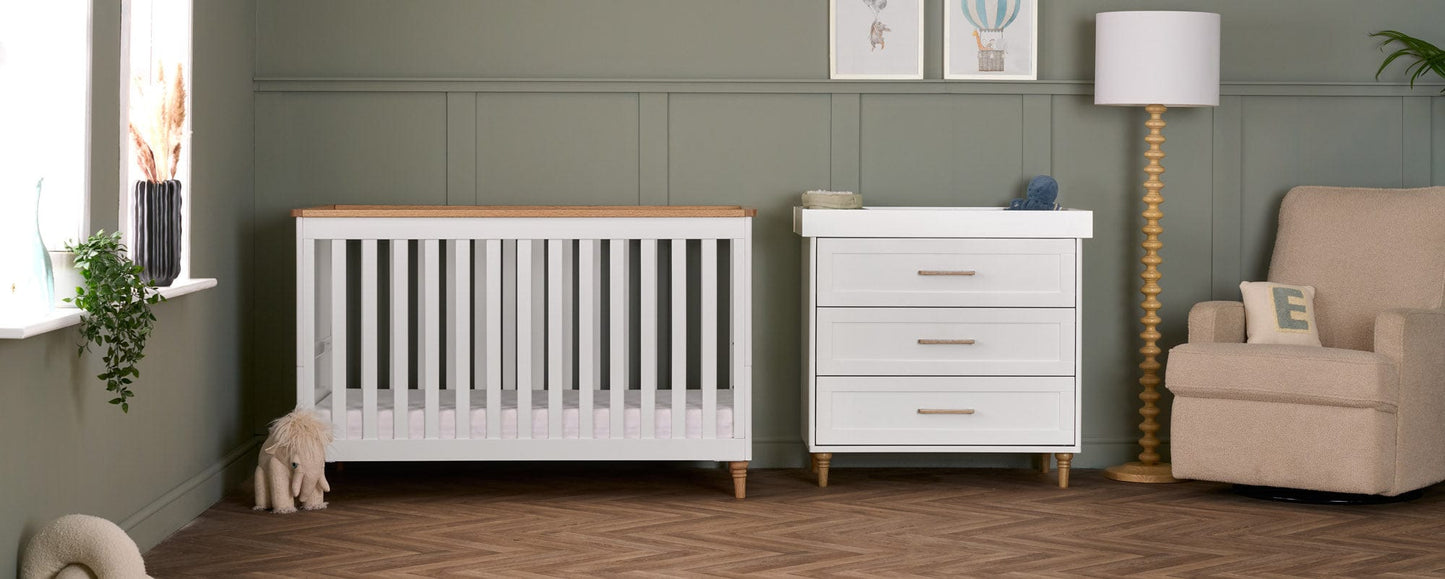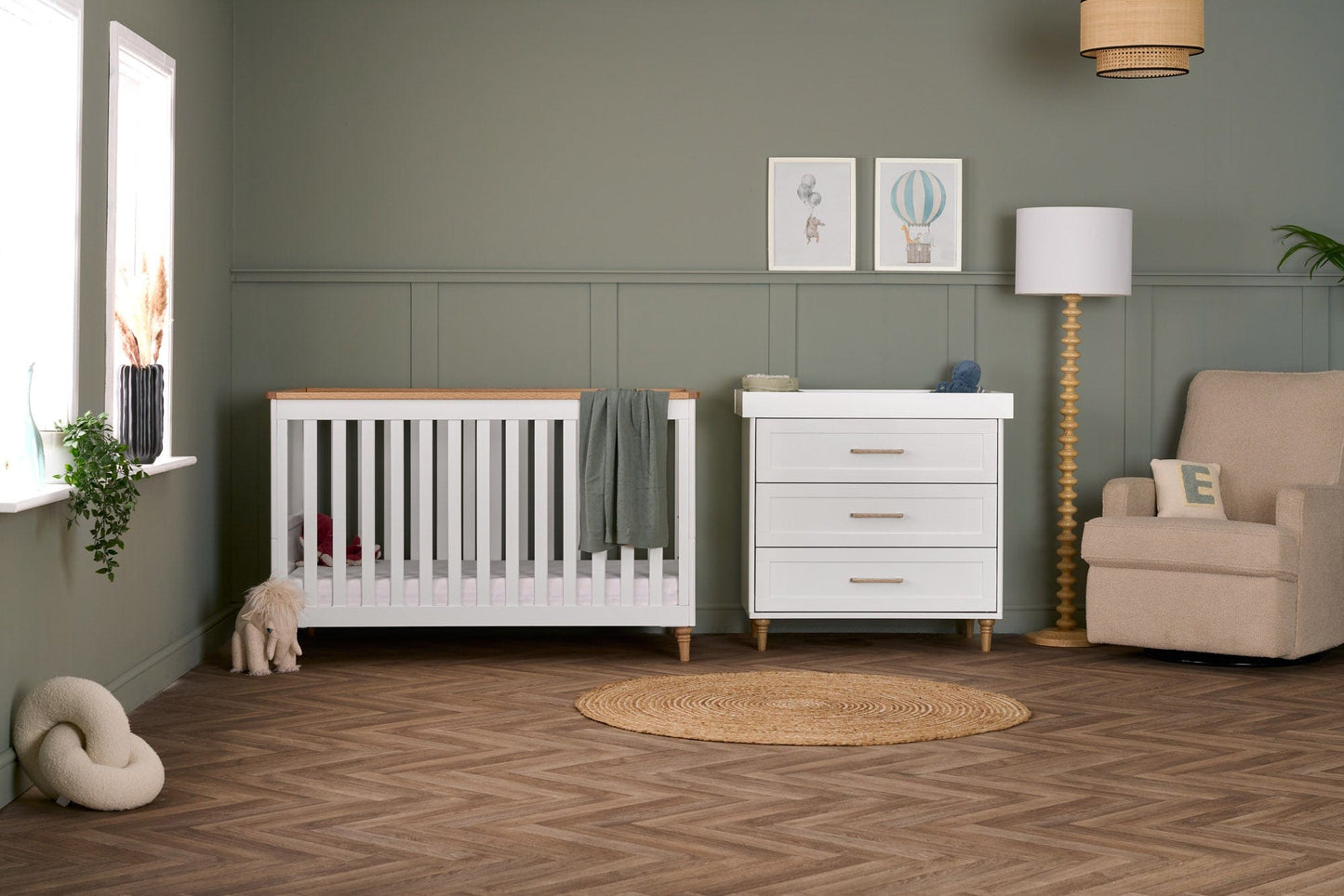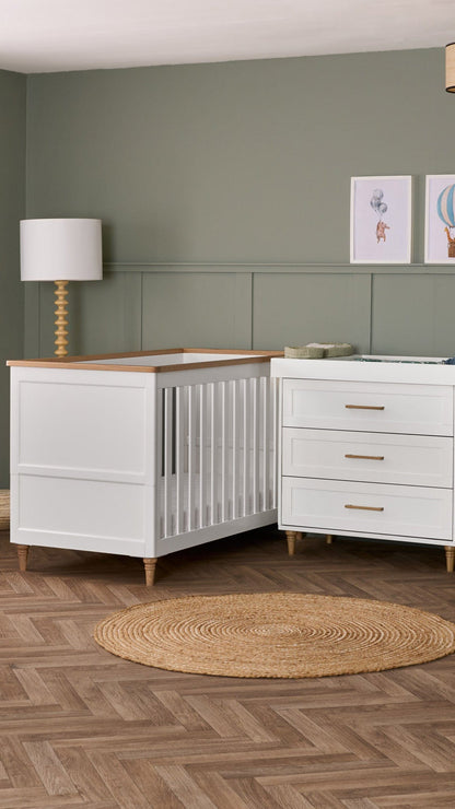 Completing the set is the practical yet elegant Orla Changing Unit. Featuring three spacious drawers with smooth-glide runners, it offers plenty of storage for clothing, nappies, and nursery essentials. The removable changing top creates a functional changing station in the early months, and easily converts the unit into a timeless chest of drawers as your child grows.