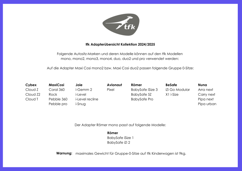 The TFK Mono2 Car Seat Adapter offers seamless compatibility with a wide range of Group 0 infant car seats, making transitions between your car and stroller effortless. Designed for use with the TFK Mono2 stroller, this adapter is perfect for Maxi Cosi seats and other leading brands such as Römer (BabySafe iSize 3), Kiddy, Joie, Cybex, and BeSafe.
