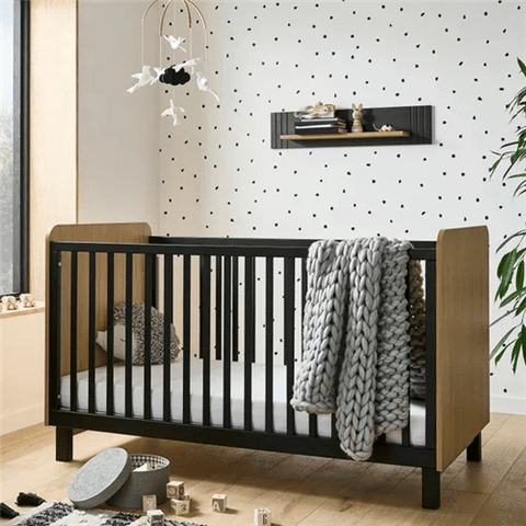 The black Rafi Cot Bed boasts a bold style that's perfect for the contemporary nursery. Its two-tone colour scheme features warm, natural oak tones and a black painted finish. Developed to accompany your little one through their early years, the cot bed can be used from birth until 5 years old and can be adjusted to suit their growth. With 3 mattress base positions, the cot bed can grow with your child, and once they outgrow it, you can easily convert it to a day bed.