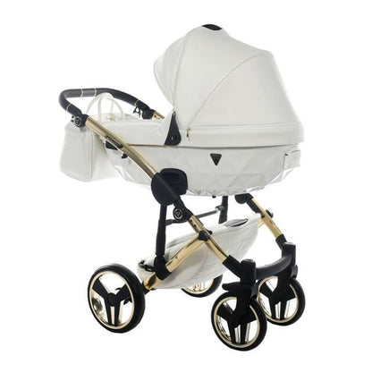 Experience the perfect blend of style, comfort, and functionality with the Junama Diamond Premium White & Gold Leatherette Travel System. This stunning pram boasts a sleek design featuring a White carrycot with a striking diamond pattern, complemented by a shimmering gold frame, gold wheel rims, and luxurious eco-leather detailing. The high-quality eco-leather hood is easy to clean, ensuring it stays looking fabulous throughout your adventures.