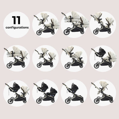 What truly sets the MB33 apart is its 11 different configurations, allowing you to customize the pushchair to suit your family’s needs. Whether you're using it for newborns, toddlers, or both, the MB33 adapts effortlessly, making it the ultimate 2-in-1 tandem pushchair.