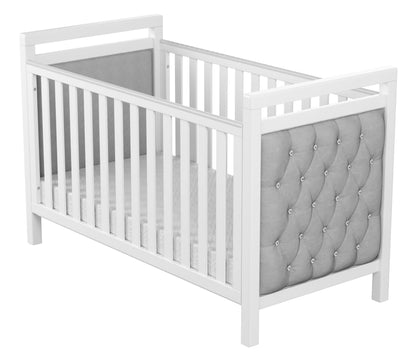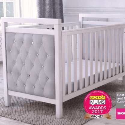 Introducing the BabyMore Luxurious Soft Touch Velvet Cot Bed – a timeless masterpiece seamlessly marrying elegance with functionality. This cot bed, featuring a classic white finish and adorned with diamante tufted upholstery, makes a striking statement in any nursery.